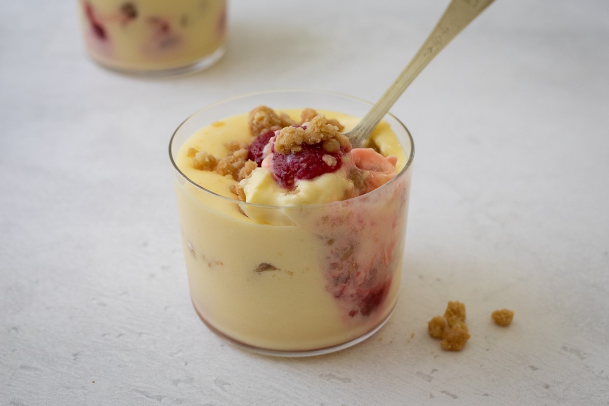 - Spoon about 1/3 cup of the Lemon Mousse into each of 6 serving glasses. Arrange 4 or the saucy raspberries around the edge of each glass, spacing them evenly, and place one in the center of the mousse. Spoon a little syrup on top. Sprinkle about ¼ cup of the Almond Crumble on top. Top with another 1/3 cup of the mousse, then finish with a few raspberries and a sprinkling of Almond Crumble. Loosely cover the tops of the parfaits with plastic wrap and refrigerate for at least 3 hours before serving.