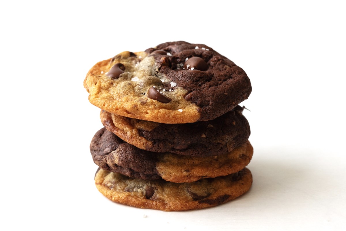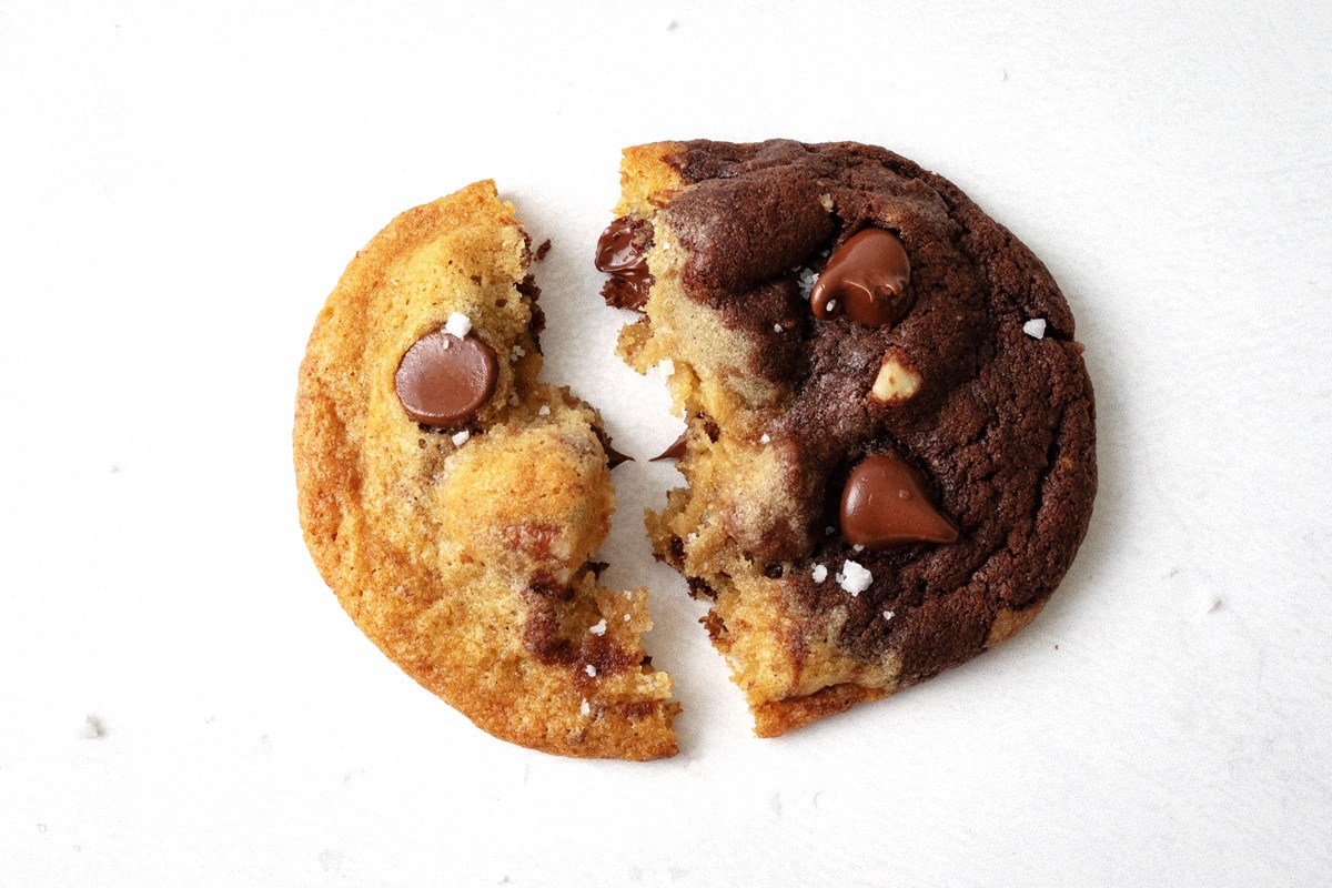 - Fill half of a #30 (2 tablespoon) scoop with the light dough, then fill the remaining half with the chocolate dough. Roll the doughs into a ball and place it on one of the prepared baking sheets. Flatten it into a disc with your palm (wet it first, to prevent sticking), then push a few of the chocolate morsels into the top of the dough for garnish. Repeat to form more cookies, spacing them 3 inches apart. Bake, 1 sheet at a time, for 9 to 11 minutes, until the lighter dough just begins to color. Let the cookies cool on the baking sheet for 5 minutes, then transfer the cookies to a wire rack and cool completely. Sprinkle the cookies lightly with the sea salt flakes before serving.